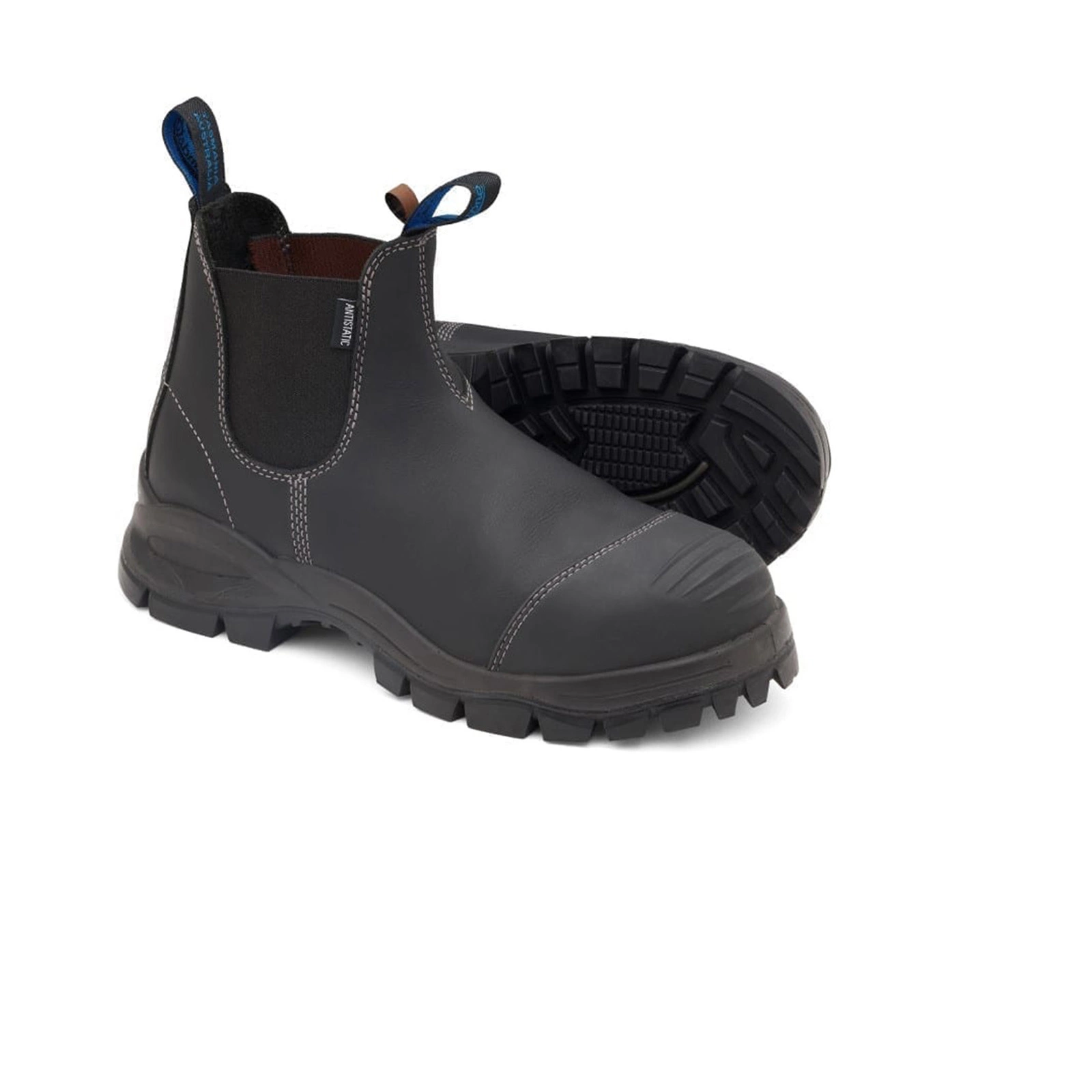 Czarne skórzane buty ochronne firmy Blundstone. Te buty zapewniają doskonałą ochronę w miejscu pracy dzięki stalowemu noskowi i osłonie palców z termoplastycznego poliuretanu (TPU), która zapobiega obrażeniom i uszkodzeniom. Podeszwa została zaprojektowana z myślą o przyczepności i trakcji na poziomie premium, aby uniknąć poślizgnięć na nierównych lub mokrych powierzchniach. Wykonane z najwyższej jakości skóry i podeszwy dla solidnego buta